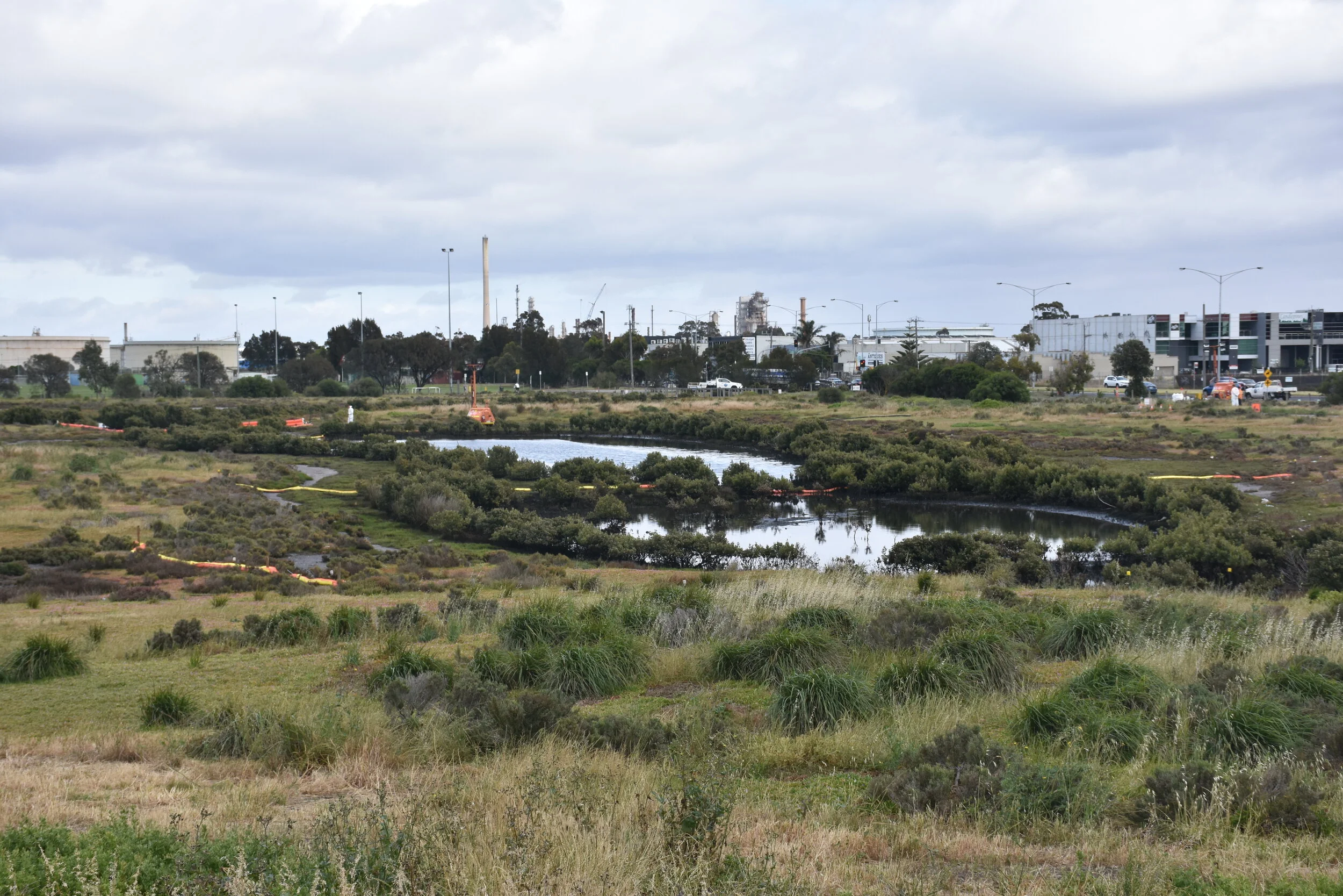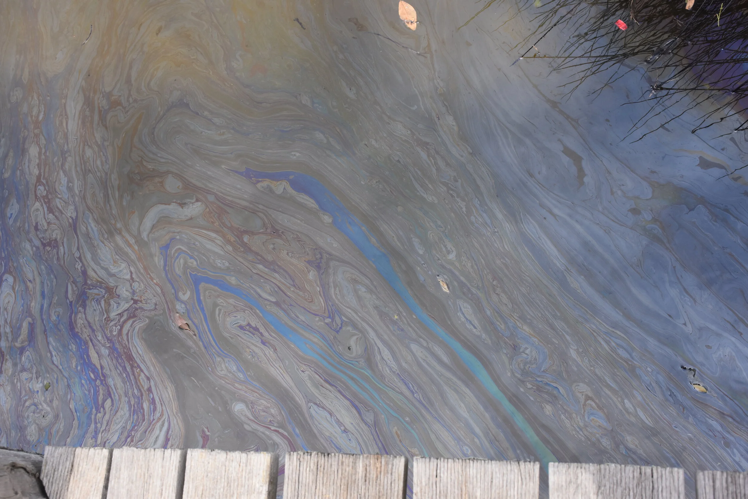 Oil residue viewed from pedestrian bridge, Challis Wetland